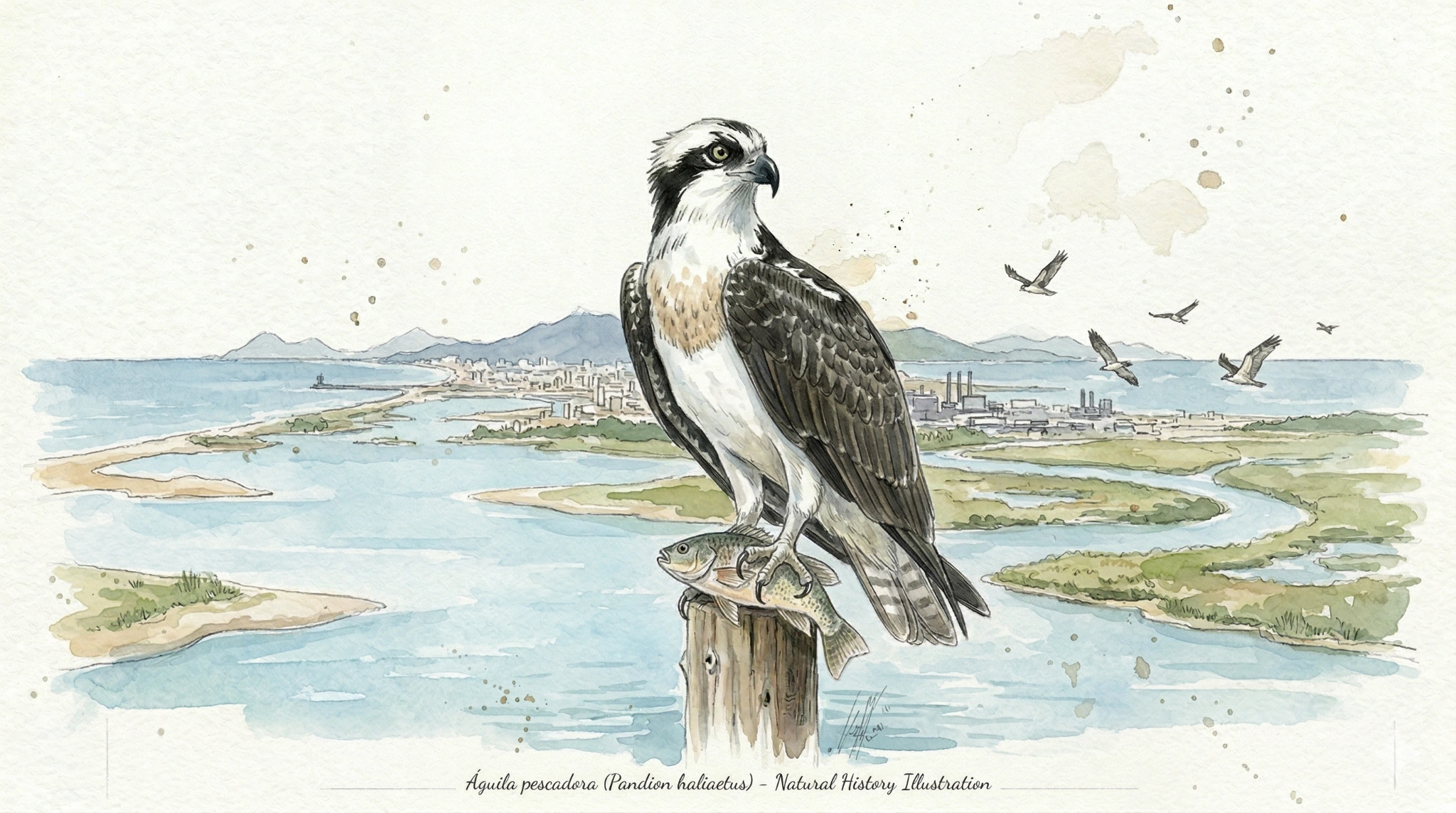 ● Águila pescadora (Pandion haliaetus): Es una rapaz que se puede encontrar cerca de cuerpos de agua como humedales, ríos y embalses, de donde obtiene su alimento.